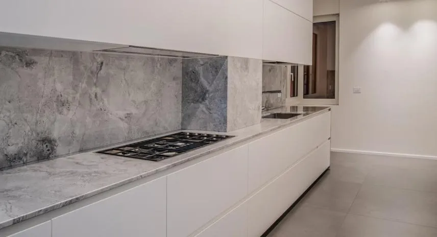 Le caratteristiche tipiche del marmo Saviné includono sfumature di colore grigio-bianco con venature grigie più scure